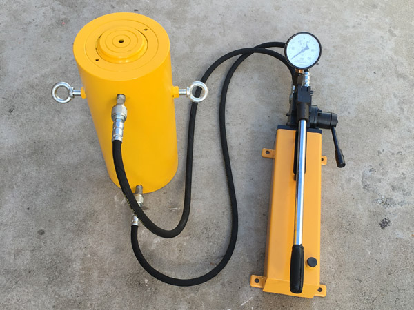 5、使用時(shí)先將手動(dòng)泵的快速接頭與頂對(duì)接,然后選好位置,將油泵上的放油螺釘旋緊,即可工作。將放油螺釘旋松,油缸卸荷。